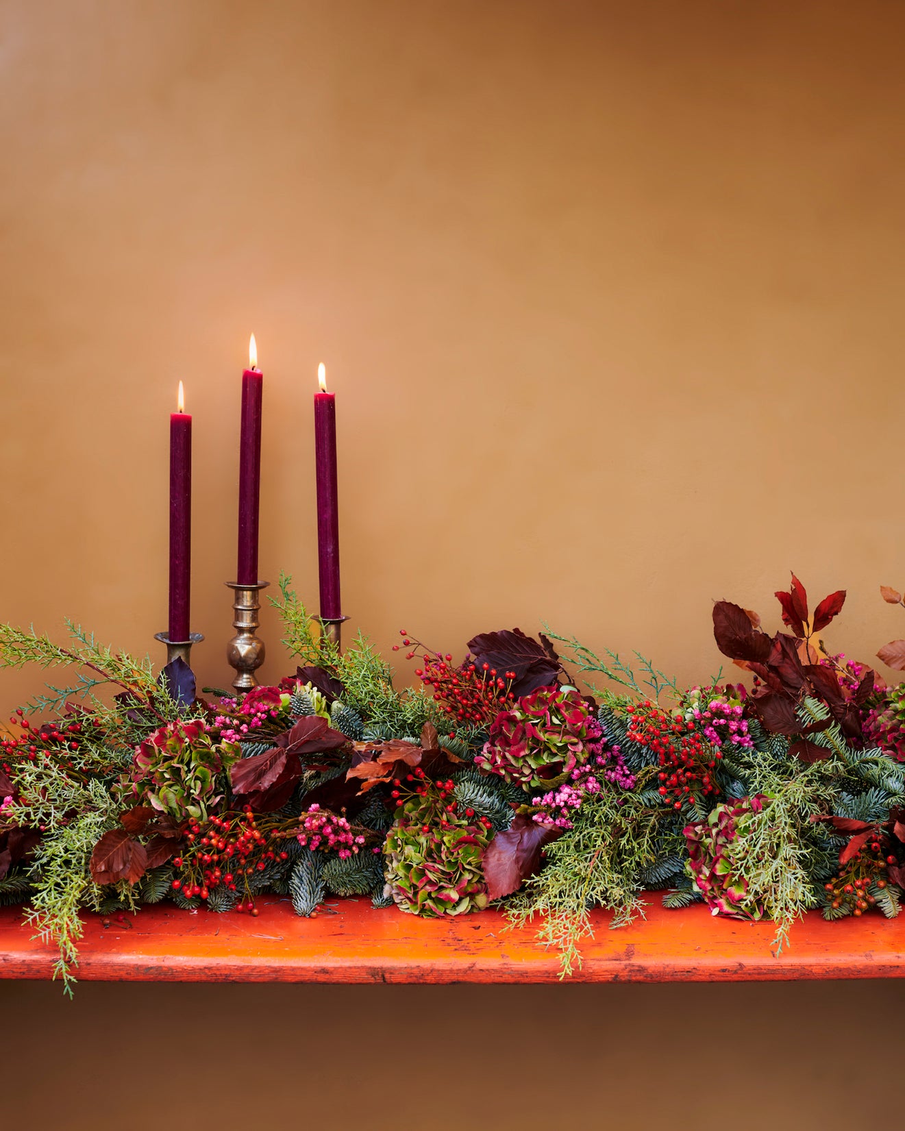A tonal garland using pine, cedar, hydrangea, hips and heather with preserved beech.