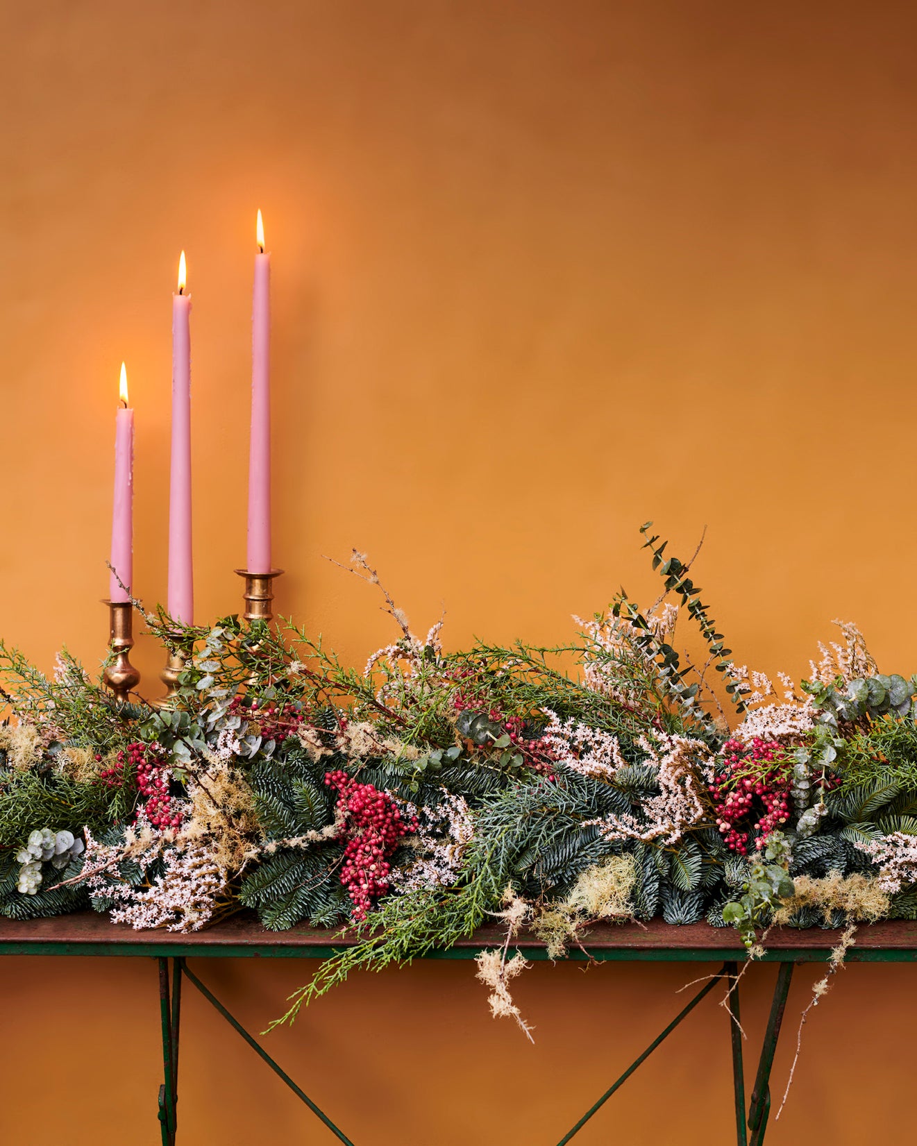 A soft festive garland with pine, spruce and cedar garland with lichen, pink pepper berries and eucalyptus.