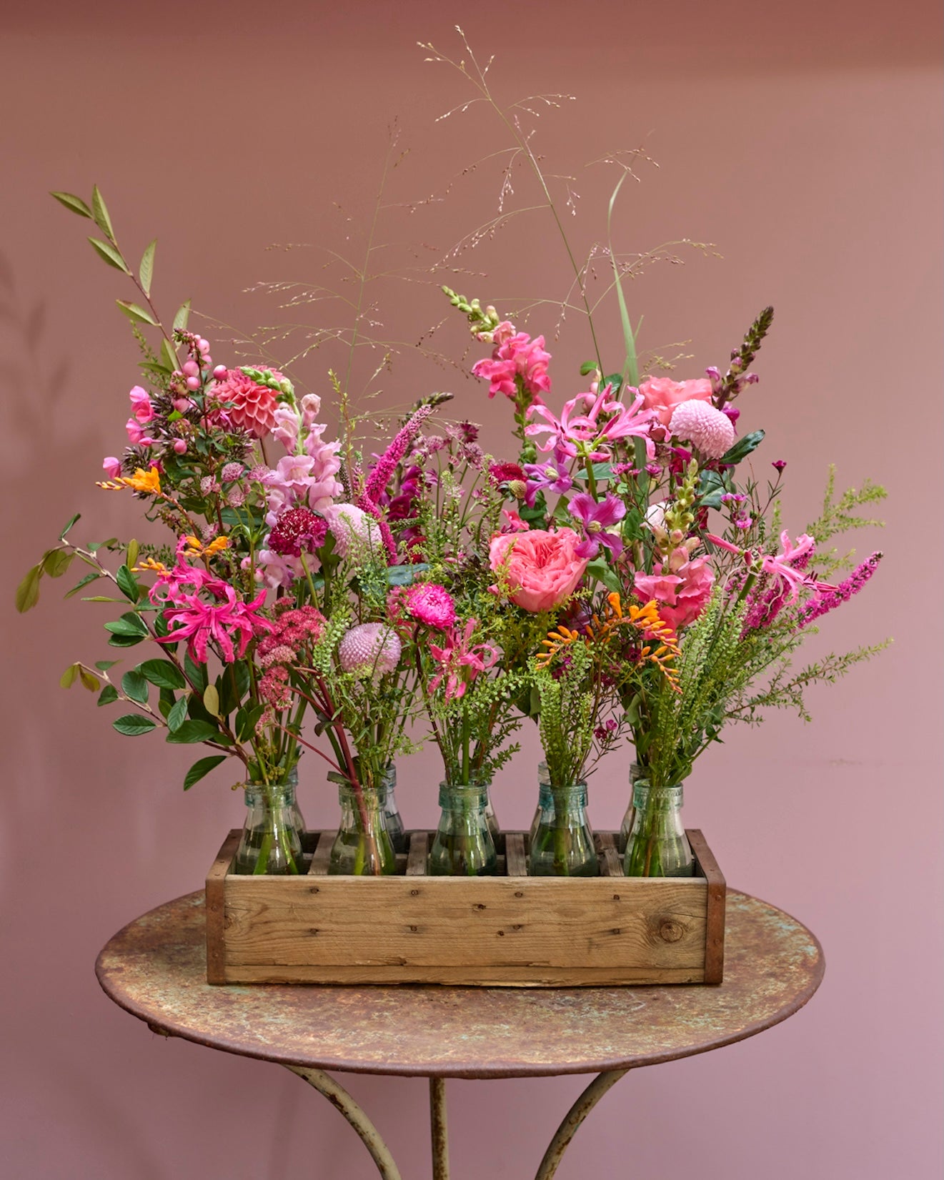 A collection of reclaimed milk bottles in a wooden crate, filled with the prettiest seasonal flowers.