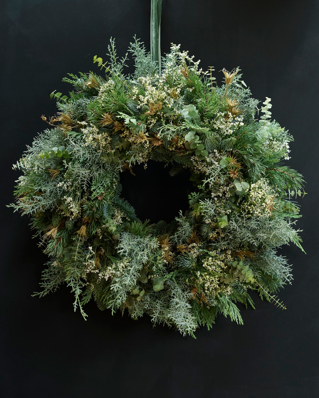 A wild wreath of limonium, nigella pods, blue spruce, eucalyptus, cedar and larch.