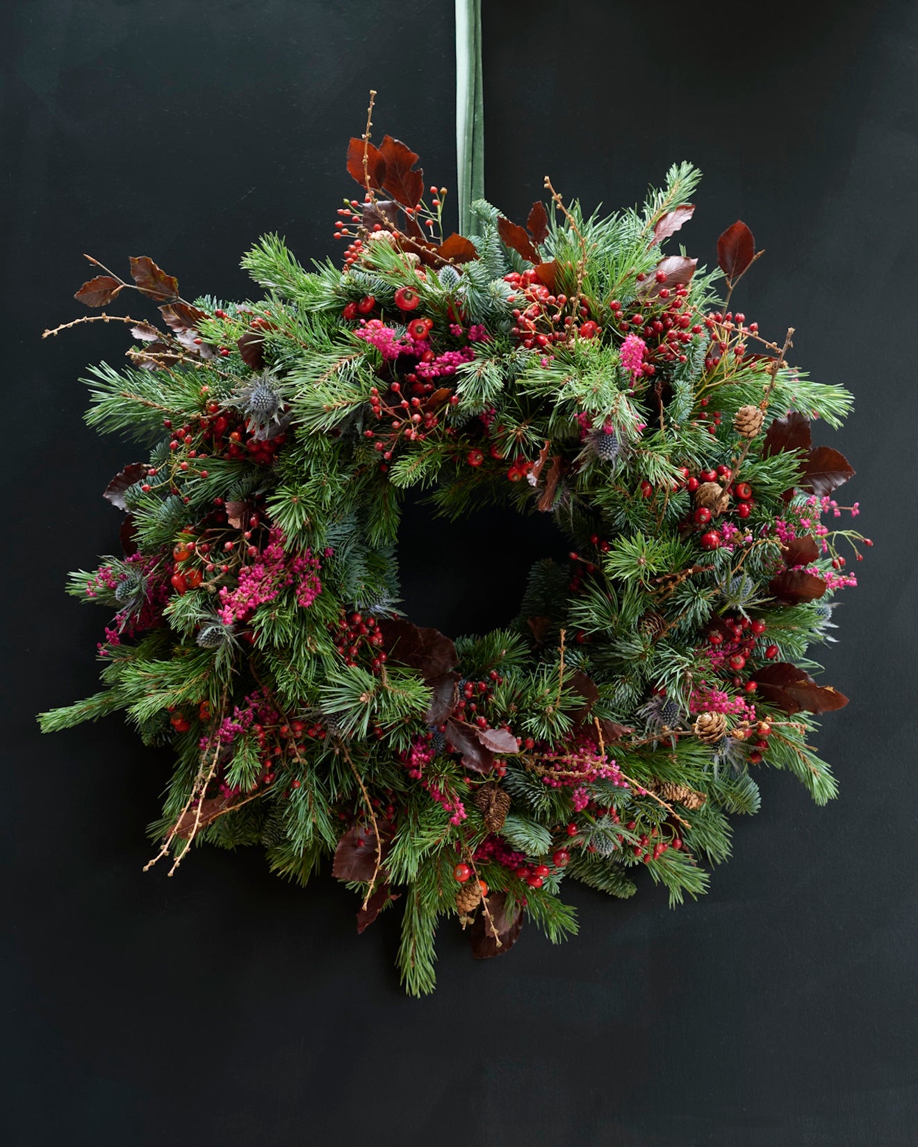 A warm wreath, with rose hips, autumnal beech, scotch pine, thistle, larch and heather.
